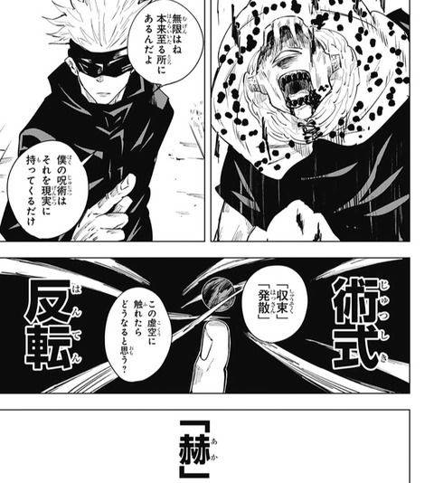 五条悟の周りに収束する無限級数を実現する術式。非常に難解な能力で原理や仕組みを理解することが中々難しい。